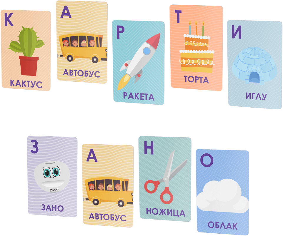 Азбучните карти за игра на Zano са специално разработени заедно с маг. логопед София Вълнеева, за да подпомагат ранното детско езиково- говорно развитие. Те могат да се използват както по време на инхалация, за да развличат детето, така и самостоятелно.